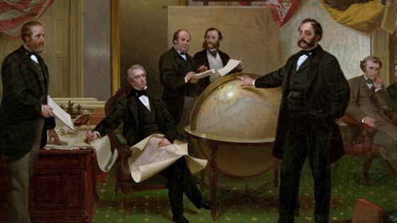 Подписание договора о продаже Аляски 30 марта 1867 года. Слева направо: Роберт С. Чу, Уильям Г. Сьюард, Уильям Хантер, Владимир Бодиско, Эдуард Стекль, Чарльз Самнер, Фредерик Сьюард.