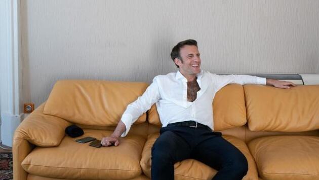 Официальный фотограф Макрона опубликовал серию закулисных снимков французского лидера. На одной из фотографий Макрон сидит на диване в расстегнутой на несколько пуговиц рубашке, демонстрируя волосатую грудь.