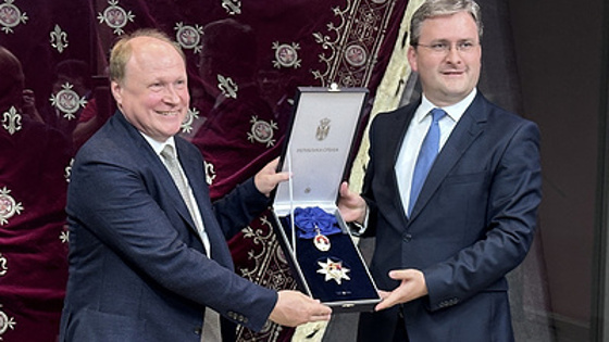 "Я сердечно благодарен президенту Сербии Александару Вучичу за то, что он отметил мои скромные заслуги такой высокой государственной наградой. Мне очень приятно, что это происходит в такой торжественной обстановке", - отметил Толстой, добавив, что выражает благодарность российскому посольству и РЦНК.