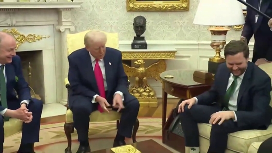 Президент США Дональд Трамп в ходе официальной встречи с премьер-министром Ирландии Майклом Мартином постоянно отвлекался на носки вице-президента США Джей Ди Вэнса, пишет The Sun.