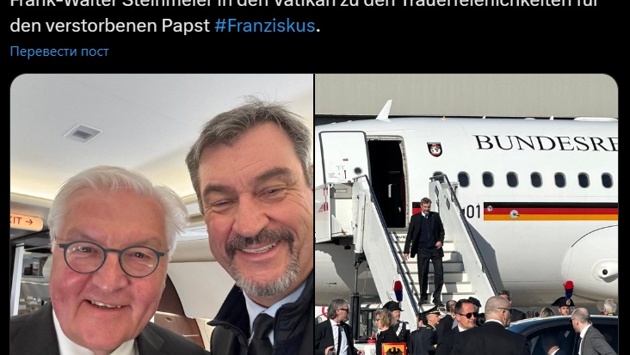 На опубликованном в соцсети X (ранее Twitter; заблокирована в РФ) снимке Штайнмайер и Зедер весело улыбаются, глядя в камеру. В подписи к фото Зедер заявил, что только что приземлился в Риме и в сопровождении президента ФРГ направляется на похороны Папы Римского.