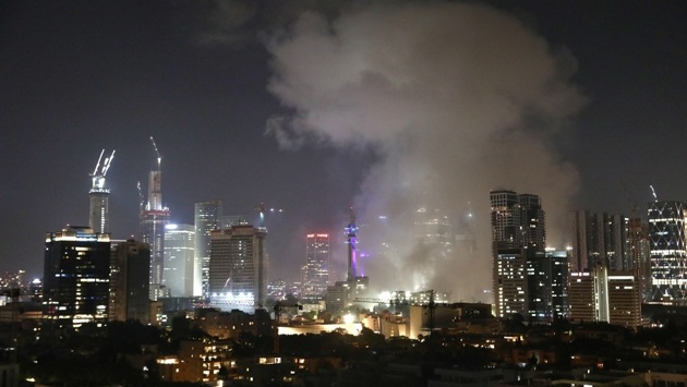 Дым от одного из мест падения поднимался такими густыми столбами, что закрывал городской пейзаж, включая близлежащие небоскребы, а яркие фрагменты перехваченных ракет описывали дугу над ними. Одна ракета попала в высотное жилое здание недалеко от центра Тель-Авива, выбив стекла на большей части фасада и превратив наиболее пострадавшие районы в нагромождение обнаженных искореженных стальных прутьев.