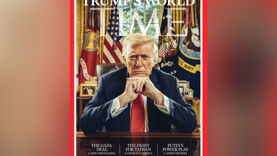 Новое изображение, на котором Трамп сидит с задумчивым прищуром, сделано за рабочим столом в Овальном кабинете. Главная тема выпуска посвящена шагам американского лидера на международной арене и называется "Мир Трампа".