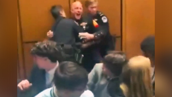 Видео, как морпеха выталкивают из зала заседания несколько мужчин, обошло многие СМИ. Мужчина сопротивляется и кричит: "Америка не хочет воевать за Израиль!".